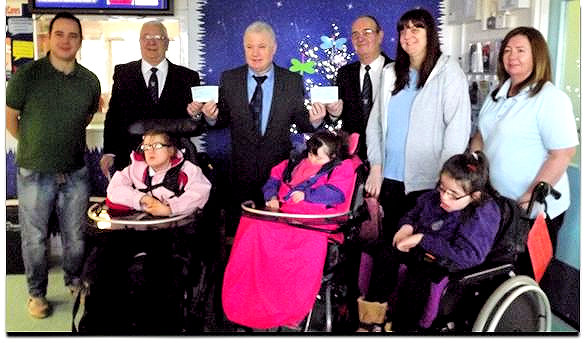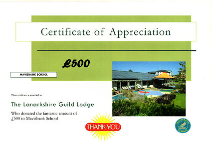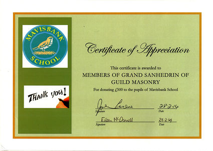 The Grand Third Master, James Pettigrew and Tom Wilson, the Kistwarden of Lanarlshire Guild Lodge, present to Mr John Lochrie, the Head Teacher of Mavisbank Special Needs School in Airdrie, a cheque for £500.00 from the Grand Sanhedrin of the Guild of Masons of Scotland and a second cheque for £500.00 from the Lanarkshire Guild Lodge respectfully. Mavisbank is a non-denominational , co-educational school which caters for children and young people between the ages of 2 and 18 years of age with complex additional support needs